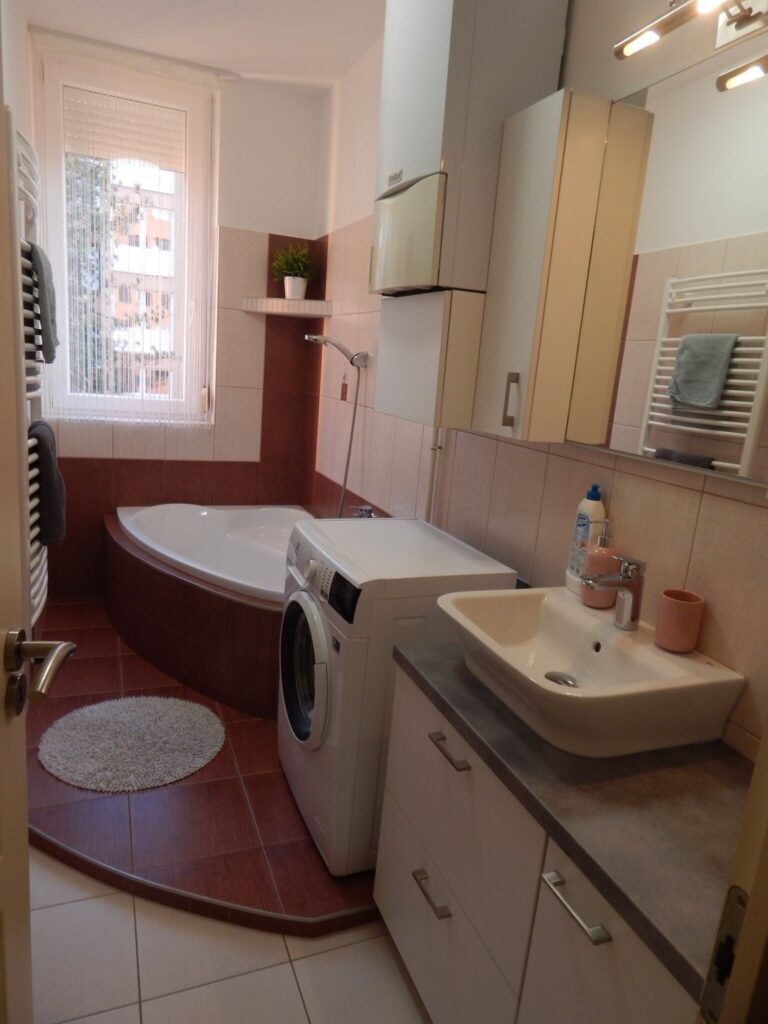 A fürdőszoba sarokkáddal, valamint mosógéppel felszerelt, a WC külön helyiségben található. A tisztaság és rendezettség biztosított minden vendég számára.
